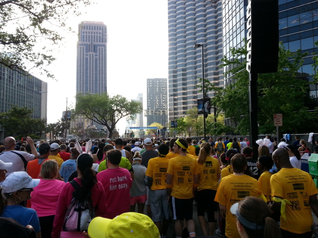 At the point we crossed the starting strip, many people continued to walk, and some people behind started complaining. So it was hard to determine what to do next. I didn’t want to run over anybody and we were packed relatively tight still. So I stayed behind some walkers until it finally started to clear out (slightly) closer to Baronne or Carondelet. Then I took notice of the runners hitting the sidewalks running past the walkers. This was probably the most narrow part of the race, on Poydras because it was near the start and it ran thru the CBD. I nearly forgot about the group of tourists that nearly tripped some of us. A few people were stationed in the CBD part of the route to cheer, but at one particular intersection some tourists decided they didn’t want to wait for the runners to pass anymore and decided to start making their way across Poydras with their luggage pulled behind. Mind you the pack was still relatively tight, so these people basically just took a chance and started darting out around people. I nearly hit the first guy. He was obviously the ringleader who decided ‘let’s go honey, we can make it’. I’m glad I didn’t actually hit him, but I kind of hope someone did. It quickly reminded me of Tigerband and that one unwritten rule that you were expected to follow or you got heckled by your peers: NOBODY BREAKS RANKS! And if someone did try to sneak thru the band, depending on who it was you were expected to stop them. If it was a girl, you pushed them back politely, but if it was a annoying drunk guy, you laid him out. Simple as that. Well, this wasn’t Tigerband. This was probably 7,000 serious runners and 10,500 not so serious ones running around the streets of New Orleans, thankfully with their clothes on.