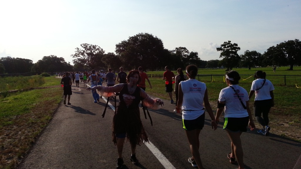 There supposedly were 400 zombies in the course and they were spread out accordingly. It seemed thin at the beginning, but it didn’t take long before we found small packs of zombies. One young girl gave chase to everybody she saw. She was scary. There was also another little girl dressed up nearly exactly like the little girl at the beginning of the Walking Dead series, holding the teddy bear. That was awesome. A few turns later, we started passing through zombie gauntlets, where there would be small packs of zombies right behind each other and they would make people perform Matrix moves to try to dodge their grabs. In the first mile or so, zombies were grabbing at you left and right because everybody had all of their balloons. Towards the end, zombies became more picky and lazy and would only give chase to people with organs left to give.