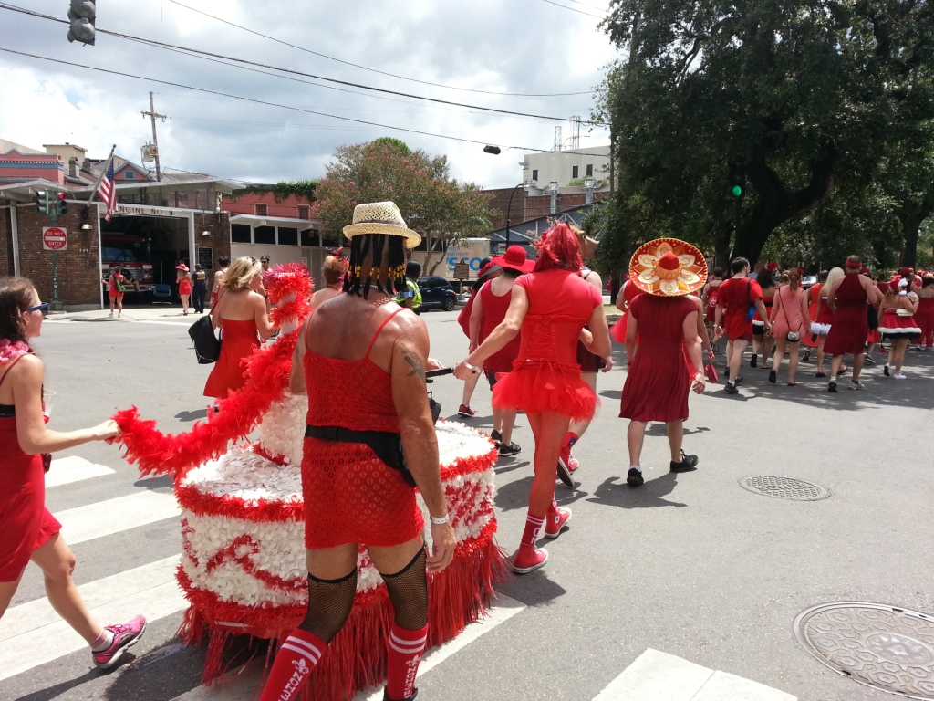 Friday night in the Quarter, I found a red sequin cap that I decided to buy because I realized that even though I had the outfit finally, I didn’t have any accessories to bedazzle it with. Haha. So as I was checking out with the hat, the guy at the counter knew exactly why I was buying it and said that a lady had come in earlier and bought three or four of them, I guess for a group. So anyway, I was proud that I had something now to bedazzle my outfit with, and I’m glad too because the next day I saw accessories galore, and many of them on the guys. Haha. I did change outfits twice. Now I see what girls have to go through. The first dress I bought I ended up hating because it really didn’t fit well at all. It was just, blah. I gave that one away and I’m glad too because it turned out not to hold water well at all (because it rained hard right after the run), so it was a pain to dry out. It didn’t look fun to run in. So I forgot where I had seen it but I decided to go for a more elastic outfit and found a full red cheerleader uniform that actually fit perfect, was short enough to reduce chaffing (because up until this point I had intended to run) and it surprisingly resisted water very well so I didn’t sweat in it or get soaked during the rain storm. So I think I made a great decision. Of course, it felt odd at first especially since this was my first Red Dress Run and I had no idea what to expect, but after running into more red dressers, it actually was way more comfortable than many of the other things I saw. At least I had full coverage. Haha.