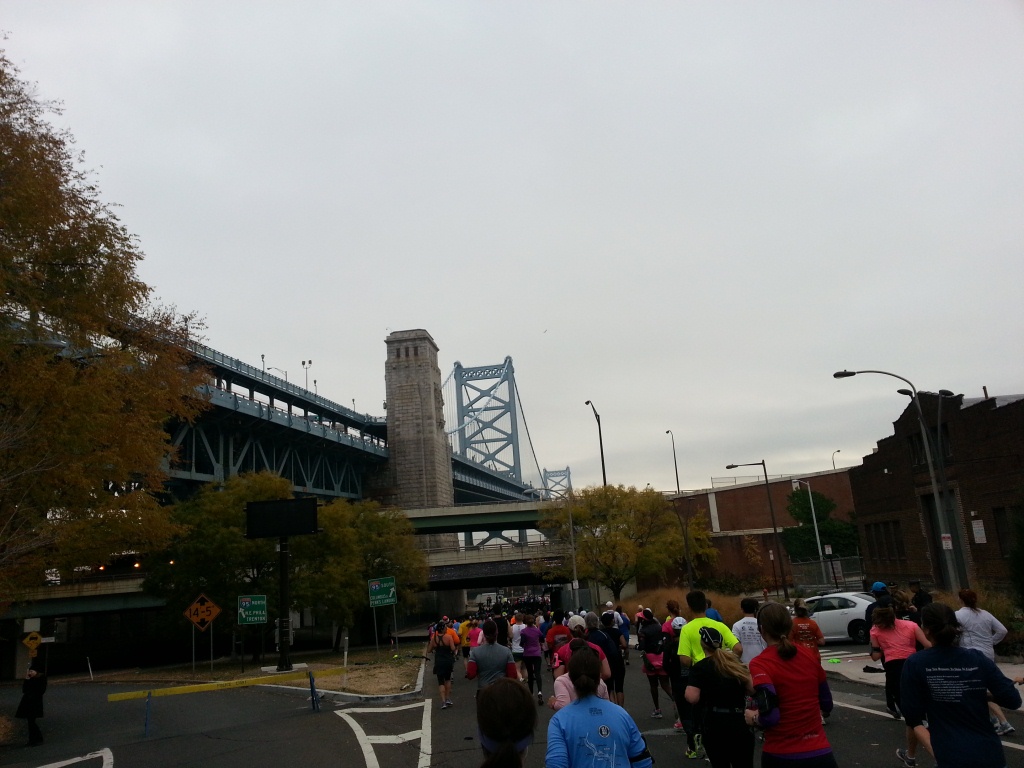 Mile 2: I realized early in the race that there was a 5:30 marathon pace group (2:45 half) and I was already well ahead of them, well ahead of my goal pace time. I also caught up to the 5:00 (2:30 half) pace group really quickly and passed them as well. This gave me a lot of motivation now to potentially finish in under 2:30 which would smash my goal an what I thought I was capable of especially for a first race. I had my Garmin with me and started it a minute or so too soon, because I wasn’t sure what to expect at the start line itself (with the crowds), so it always beeped about a minute or two before the actual split point. But I did notice that I was easily running a 10min/mi which was way faster than I was expected and I knew I wouldn’t maintain it. But I felt so good, I just kept going. I agree with what another group of women said later on, that the fact that we were always dodging people (slower runners) sort of made it easier to keep your pace quicker. I had experienced this in some other races as well, but I always forget it during a race. They had a DJ set up on Race Street (how ironic) who was playing music for the runners and we cheered him on as he cheered us on. The Mile 2 point was basically at the Ben Franklin Bridge.