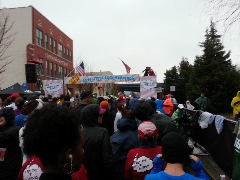 Sure enough, Sunday morning, it had already started raining a bit. The temperature still felt comfortable but you could tell that the front had passed and that the winds were coming from the north. There was a 6am start for people who estimated that it would take them longer than 6 hours to finish the marathon or half marathon. From the looks of things, there were many runners in that 6am start. And that really made a difference I believe. Many people later complained about not just letting everybody start at 6am, but I know the logistics of doing that at the last minute just aren’t very feasible. I looked at the weather one last time and then decided to head on to downtown Little Rock before 6am that way I could get a parking spot in a garage (knowing that it would be raining seriously by noon). It turned out that at 5:45am, there was practically no traffic. The 6am people were already parked and lined up and the 8am people weren’t coming in yet, so I had the roads to myself and I had my choice of nearly any parking garage spot. So i picked my spot, watched the 6am runners take off from a vantage on top of the garage, and then debated nearly an hour on what exactly to wear or not to wear for this race. I kept debating on whether or not I would get too hot in certain gear, but finally i told myself that the forecast predicted near freezing conditions so I had to stop talking myself out of changing gear. Finally I decided on something and went on to the start.