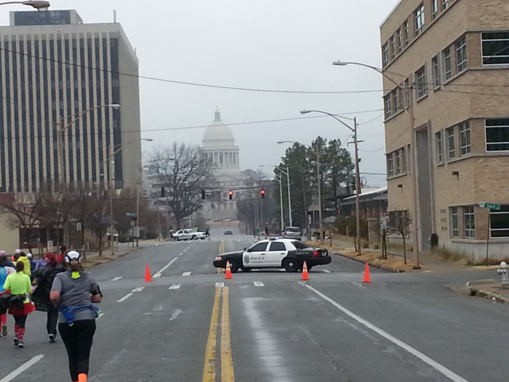 The next several miles, it became more and more miserable, like feeling knife stings across the skin as the winds continued to pick up and the temperature continued to drop. By this point, it may have already been in the 30s but I didn’t know it. I didn’t think it was, but someone else said they passed by a bank in NLR and saw the sign say 39. I didn’t see a sign until Mile 12 and it said 37. But I felt it well before then. By Mile 8, I was beginning to slow up considerably. Each time I stopped, I found it harder and harder to start back running. I could walk, and actually found it more enjoyable because I was able to keep my hands in my pockets then. By now, around 2 hours in, my hands were freezing. I seriously lost feeling in parts of my fingers. This became very miserable. I followed along with a pack I had grown accustomed to staying with who were beginning to walk much more as well. Right around Mile 12, where the marathoners would turn off to complete their course towards 26, we noticed that the police and coordinators had shut the course down, not letting marathons continue along the marathon course. They had to finish with the half marathoners. They kept saying “severe weather”, but I had no idea whether they meant lightning or ice. Turns out they meant lightning, but I never saw any lightning until well after I left town. But the rain did begin to come down even harder in that last mile.